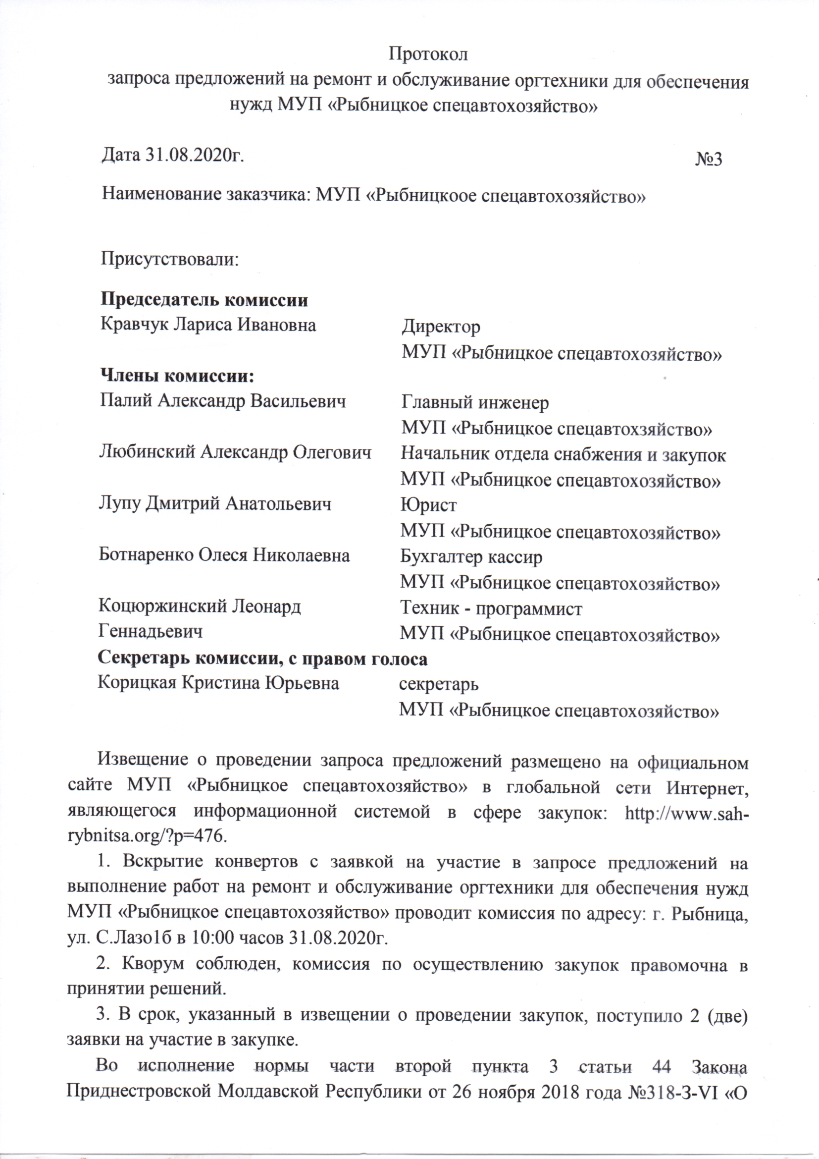 Протокол запроса предложений на ремонт и обслуживание оргтехники для обеспечения нужд МУП «Рыбницкое спецавтохозяйство» sahrybni 01.09.2020